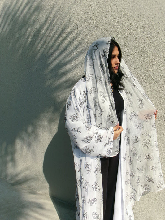 Embroidery on crushed chiffon. The open front gives numerous possibilities for styling. Comes with a matching...