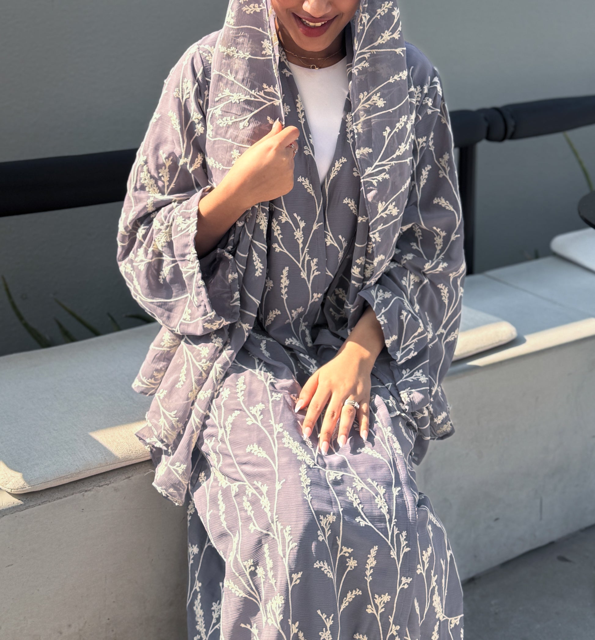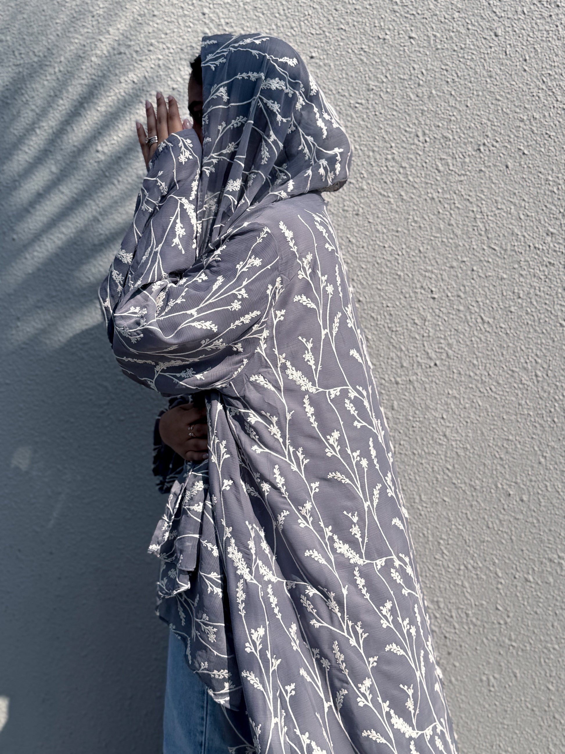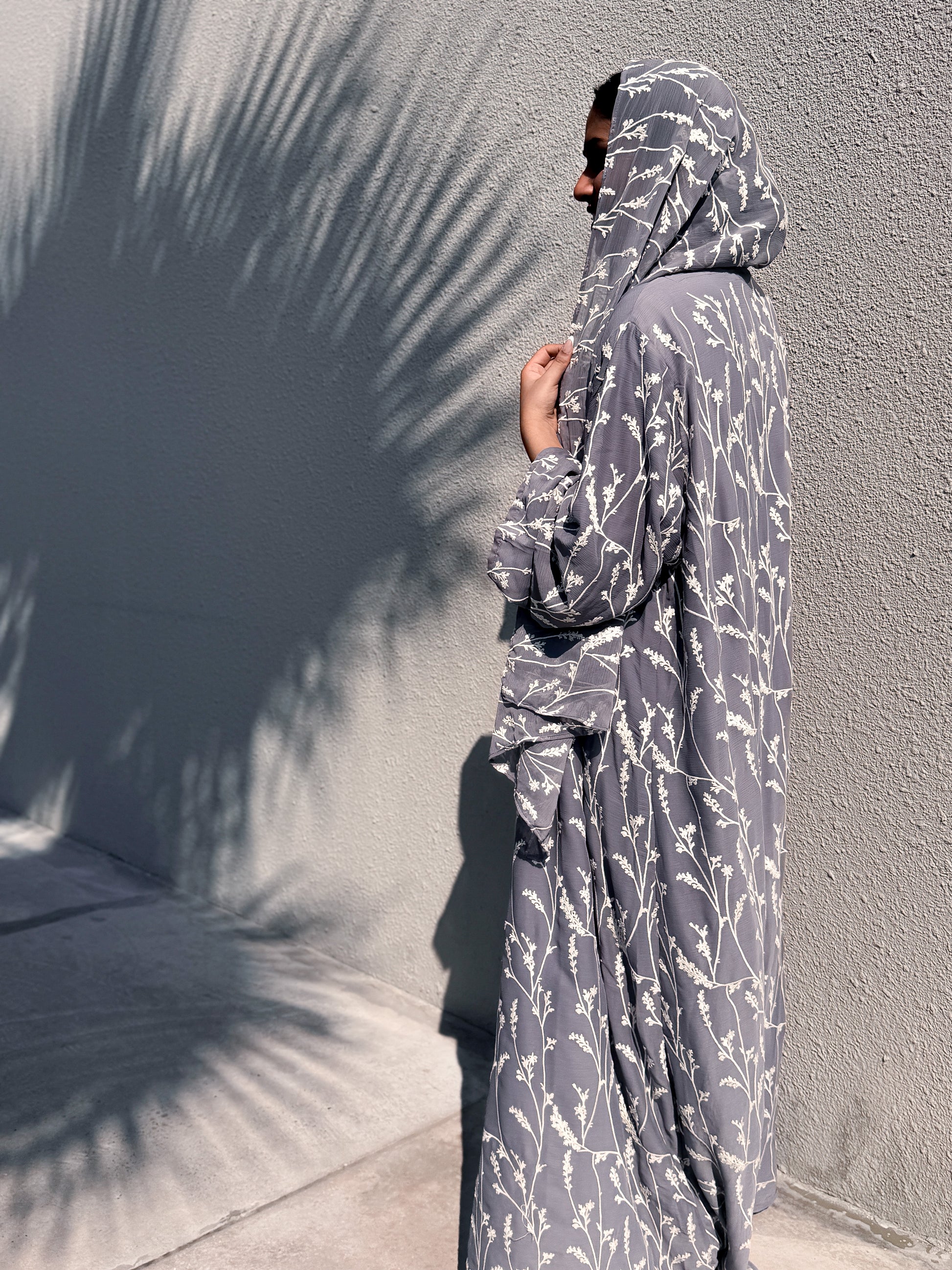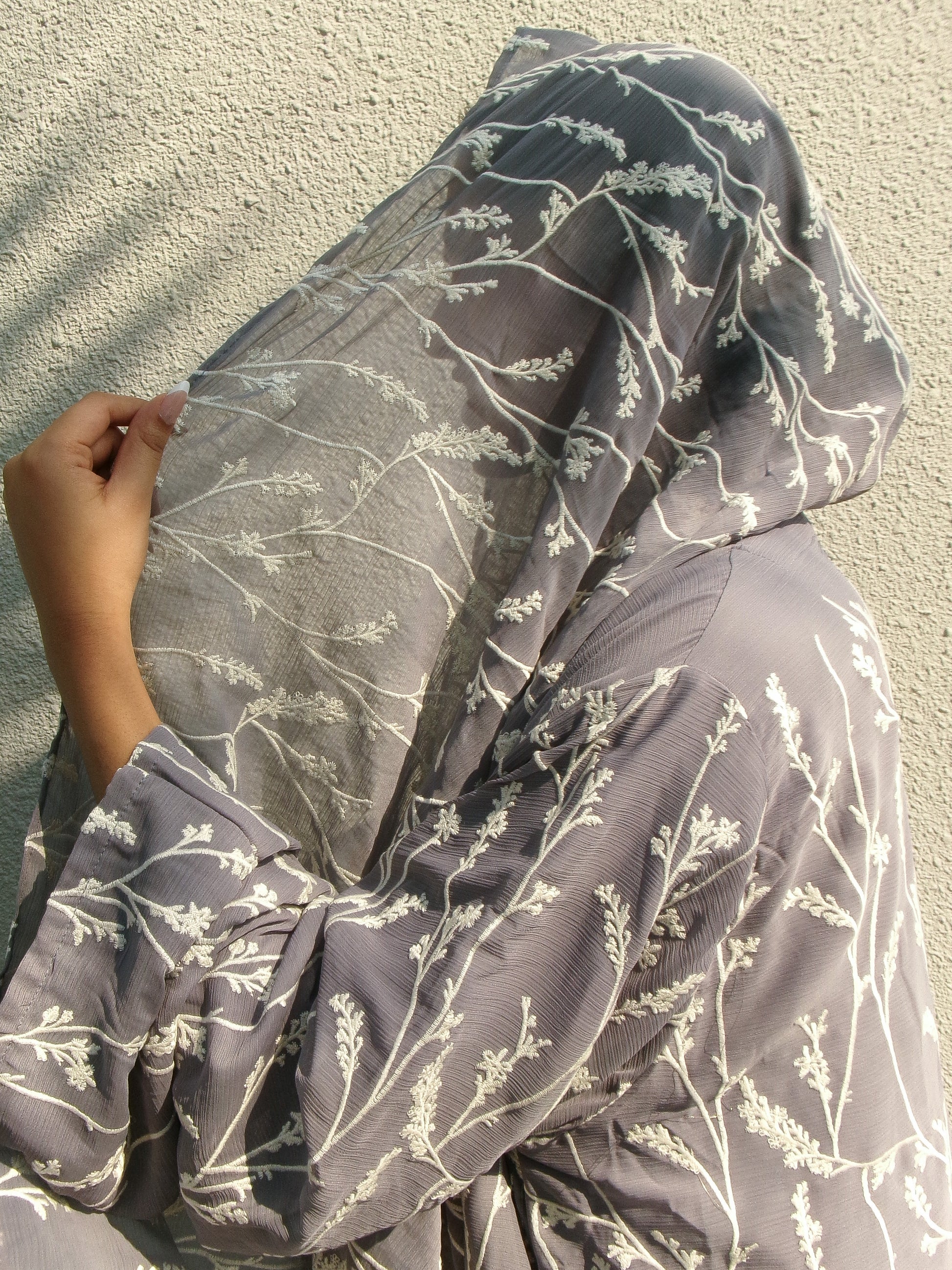 Embroidery on crushed chiffon. The open front gives numerous possibilities for styling. Comes with a matching hijab