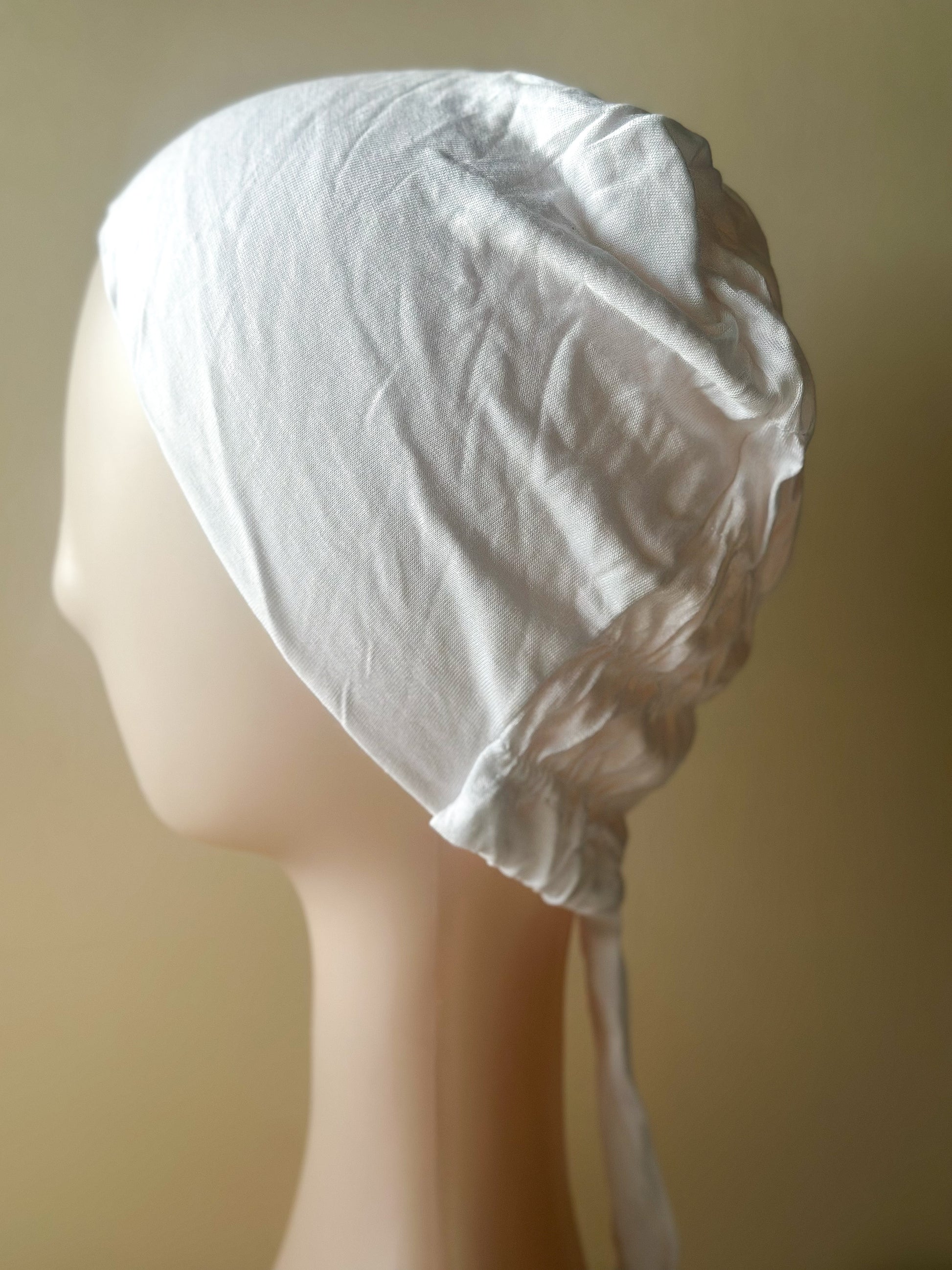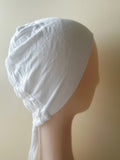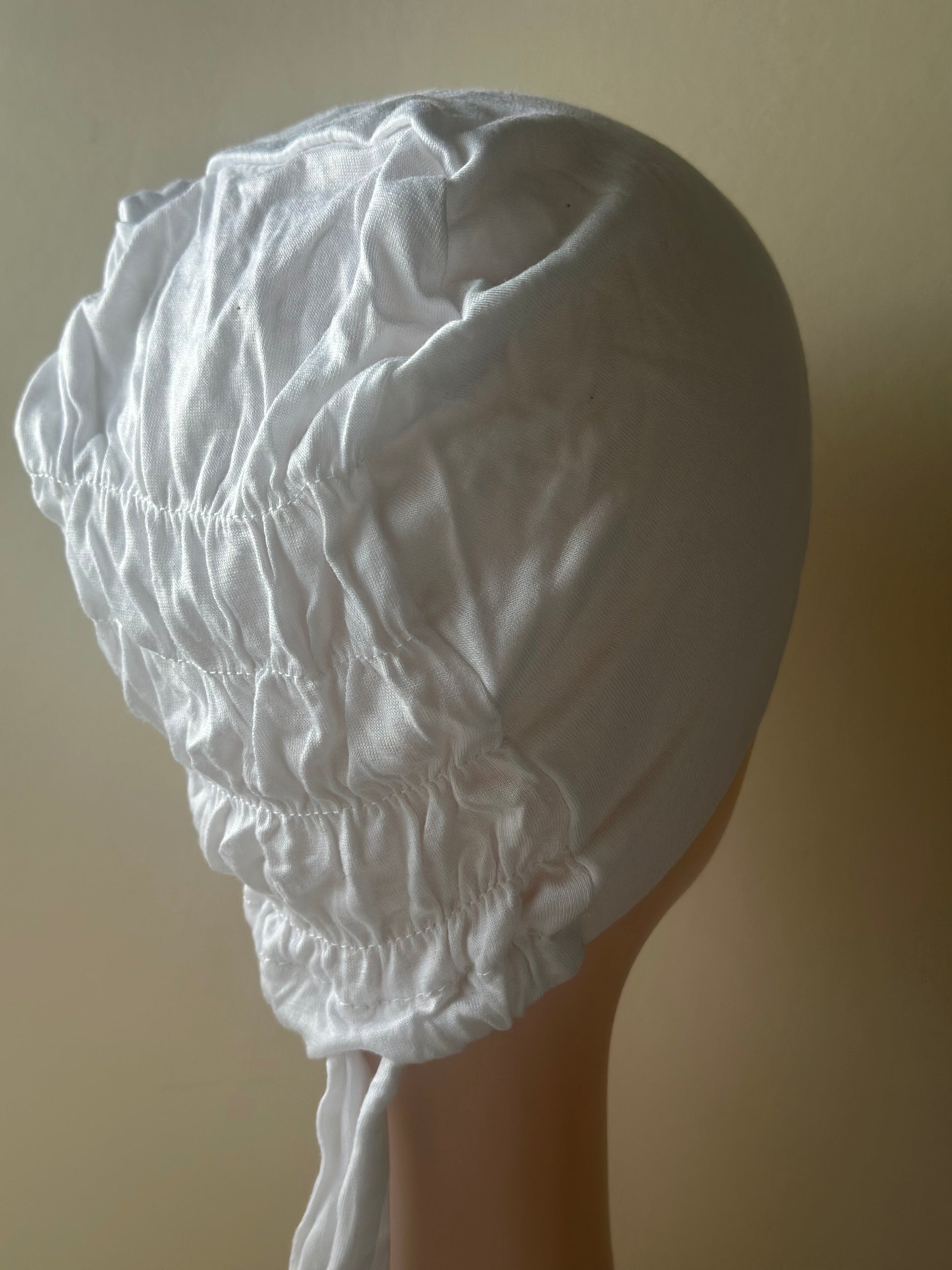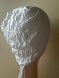 Cotton undercap with stretchy back tie , helps to hold hair without damaging it .